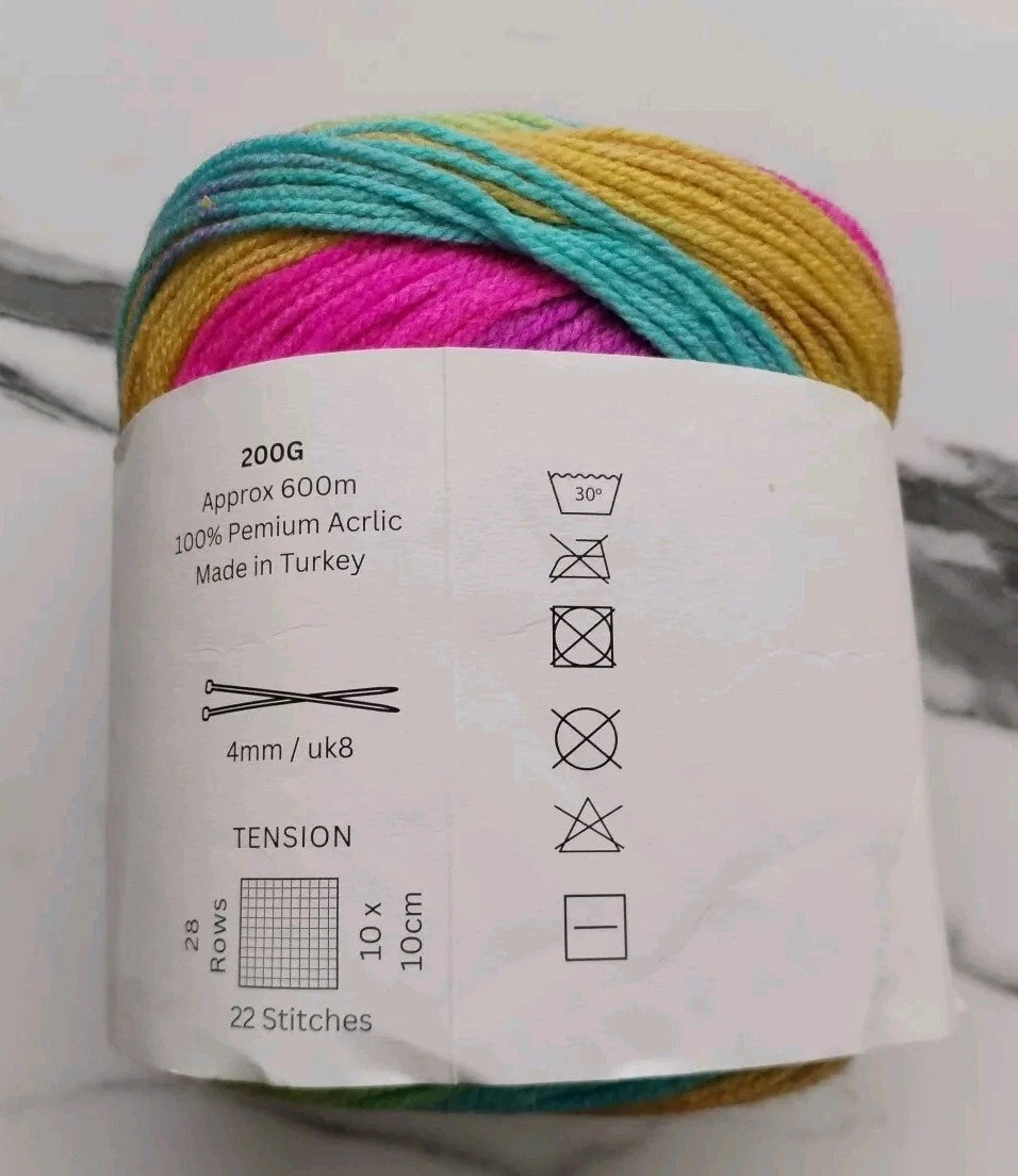 Introducing this 200g Doubleknit cake from Woolcraft! These vibrant colours and self-striping yarn is perfect for all your knitting and crocheting needs. Made from 100% premium acrylic, each ball contains a generous 600m of yarn, making it a great value for your money.